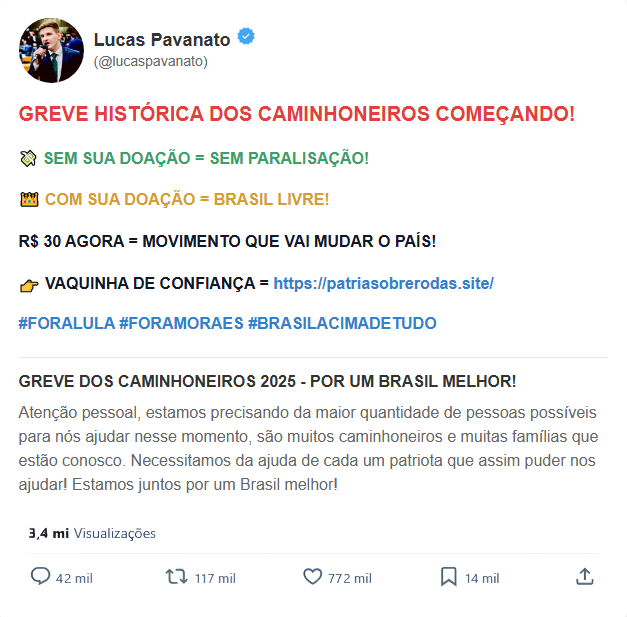 Minha contribuição já foi feita vamos juntos patriotas! Brasil acima de tudo!